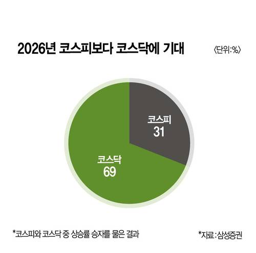 올해 코스닥을 향한 투자자 기대가 크다. 삼성증권이 자산 30억원 이상 SNI 고객 401명을 대상으로 ‘2026년 주식 시황 전망·투자 계획’에 대한 설문조사를 진행한 결과다. 응답자 69%가 코스피보다 코스닥 상승률이 높을 것으로 전망했다. 지난해 코스닥은 연간 36% 상승률을 기록해 코스피(76%)에 뒤처졌다. 특히 이번 조사에서는 4년 만에 ‘천스닥’ 탈환 기대감이 반영됐다. 응답자 59.6%가 코스닥지수가 1000포인트를 돌파할 것으로 내다봤다. 그중 29.3%는 1100선마저 넘어설 수 있다고 답했다.
