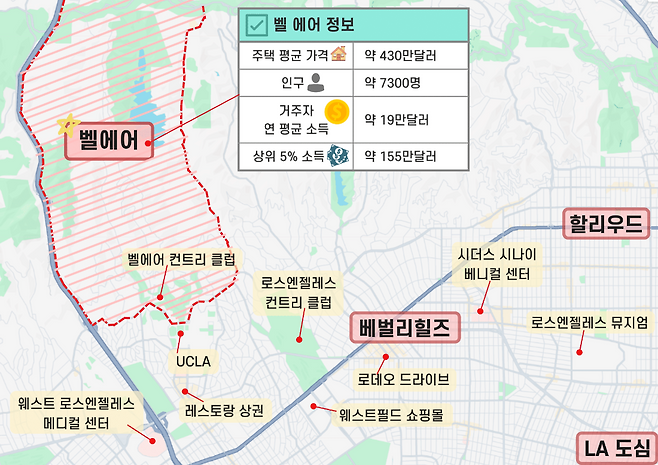 ‘벨 에어’는 지리적으로 로스엔젤레스(LA) 북쪽에 자리하고 있다. 동쪽에는 베버리힐스, 남쪽에는 미국의 명문대학 중 한 곳인 로스앤젤레스대학(UCLA)이 각각 위치해 있다. 도시의 모든 인프라를 누리면서 사생활 보호에도 용이한 지리적 이점을 지니고 있는 셈이다. 이러한 지리적 특징은 글로벌 슈퍼스타와 유명기업 CEO 등이 둥지를 트고 있는 미국의 대표 부촌으로 거듭나게 만들었다.