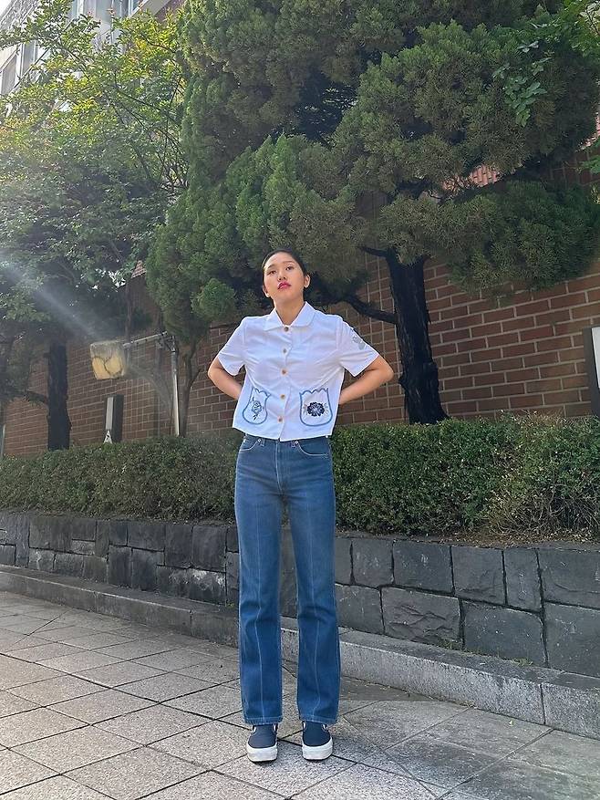 미미가 선택한 상의는 앞면에 아기자기한 캐릭터 자수가 새겨진 반소매 셔츠로, 귀여운 감성과 위트를 동시에 잡았다. 버튼다운 디자인으로 단정한 느낌을 주면서도, 포켓 위에 새겨진 그림 자수가 시선을 사로잡는다. 하의는 레트로한 무드를 담은 진청 플레어 데님. 발등까지 자연스럽게 퍼지는 실루엣이 하체 라인을 슬림하게 보정해주며, 캐주얼하면서도 빈티지한 분위기를 더한다.