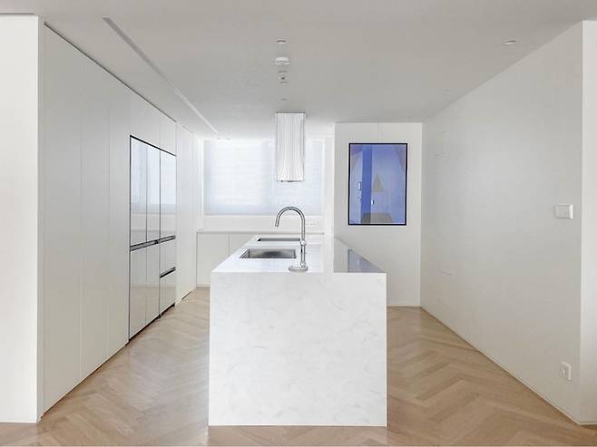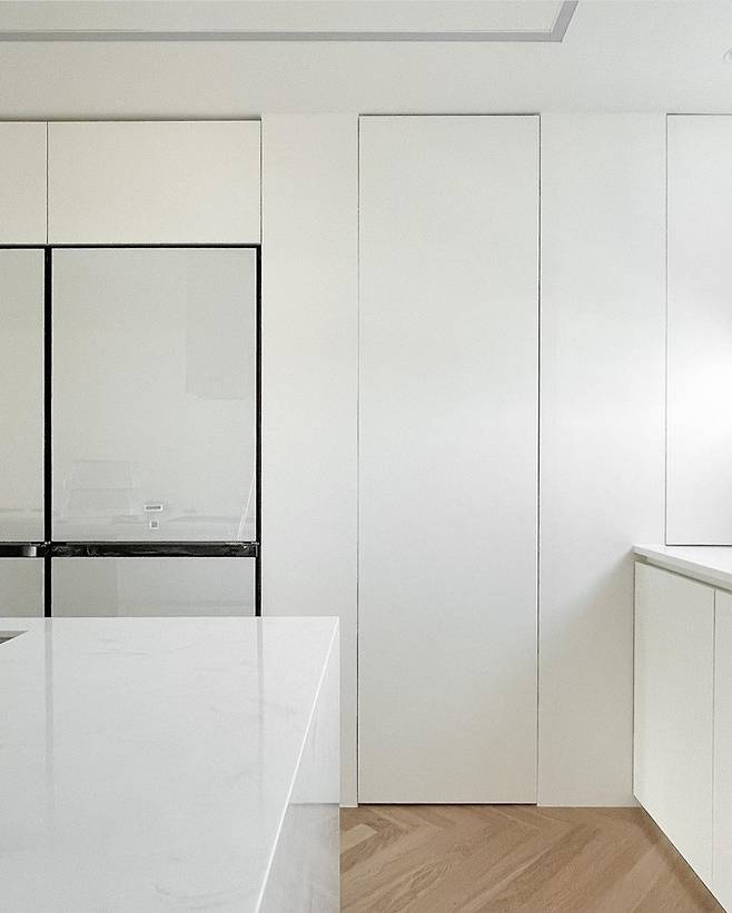 레이아웃을 계획할 때 디자인 실장님이 주방 구조 변경으로 3안을 주실 정도로 주방 구조 변경이 가장 다이나믹했어요. 저는 미니멀하고 심플한 화이트 공간을 좋아하는데 제 취향에 맞춰서 설계해주셨어요. 30평대에서 흔히 볼 수 있는, 거실에서 주방이 꺾어진 구조가 아니라 거실-주방이 일직선이라서 3.5m의 긴 아일랜드 설치가 가능했어요. 그리고 보조 주방을 확장해서 주방이 훨씬 넓어졌어요.