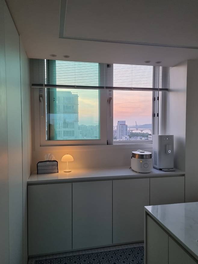 남동향집이라 거실 반대편에 위치한 보조주방 창으로 노을을 볼 수 있어요. 눈호강합니다.