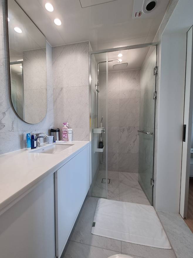 욕실 천장에 힘펠 환풍기 보이시나요? 적극 추천합니다. 건조, 드라이 다 잘 이용합니다. 냉온풍, 바람 세기를 조절할 수 있어서 편해요. 휴젠뜨 설치한다면, 잘 생각하셔서 위치를 잡으세요. 저는 세면대 바로 근처가 좋았어요.