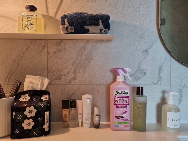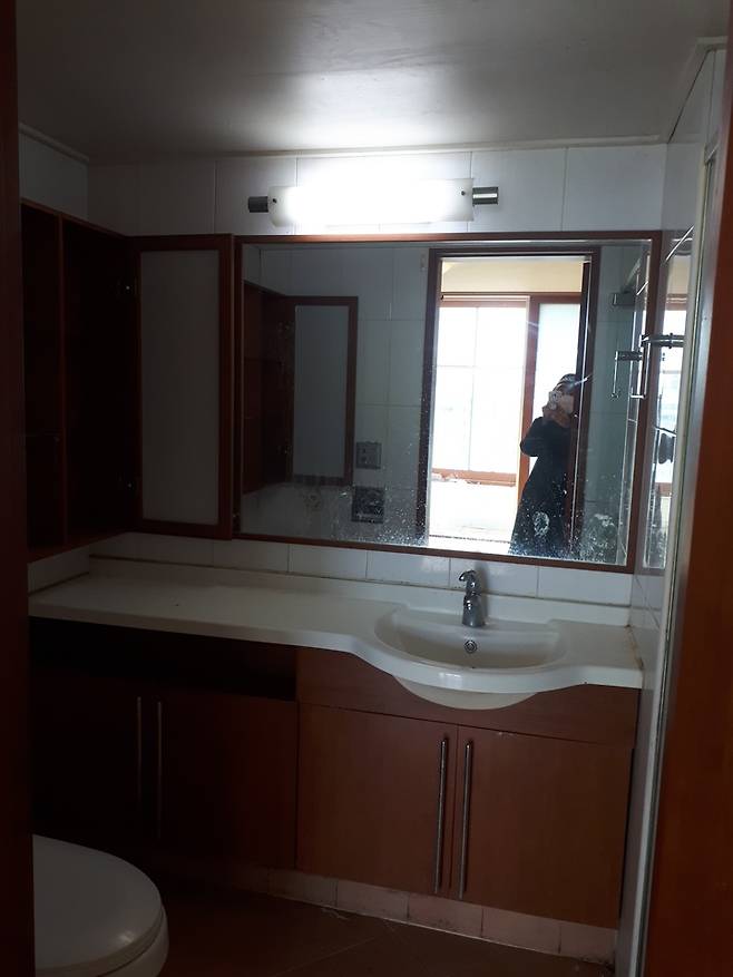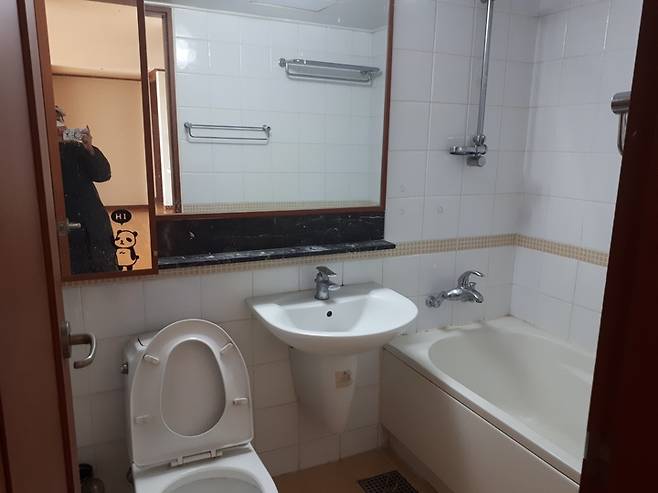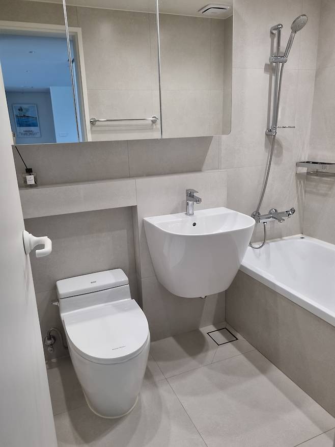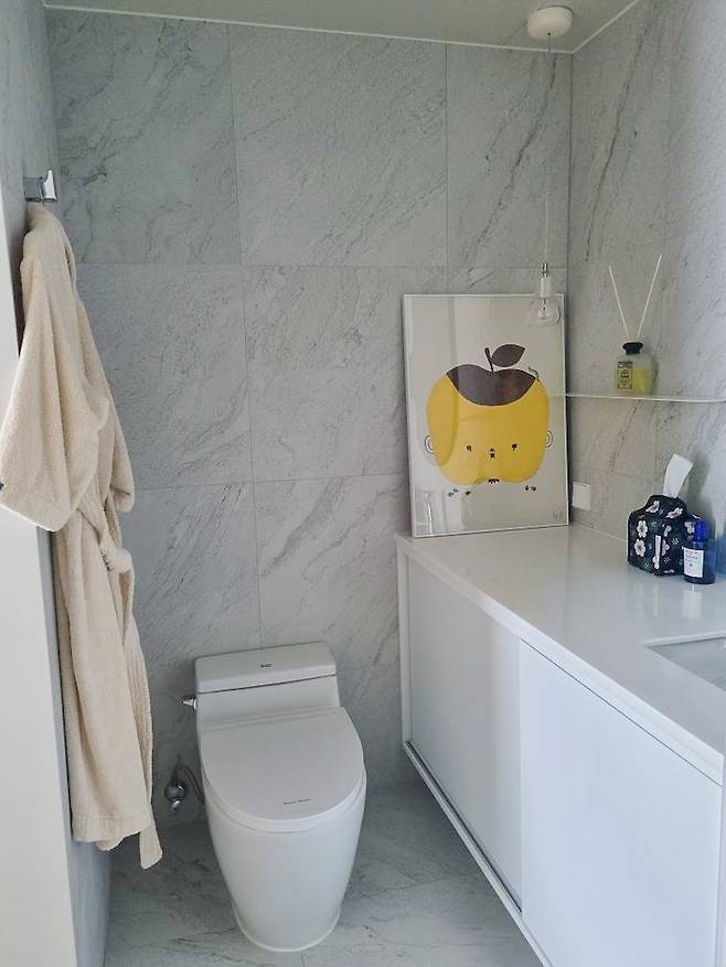 기본에 충실한 거실 욕실입니다. 딱 깔끔하게 리모델링해서 잘 유지하고 있어요. 상부장 유리 청소까지 끝내고 산뜻한 마음으로 사진 찍어 봤어요. 예산이 더 있을 경우 다음으로 투자할 공간을 꼽으라고 하면 욕실에 좀 더 신경을 써볼 것 같아요. 슬픈 현실이지만, 돈 들인 만큼 예쁘게 나오더라고요. 인테리어 경험자들께서는 공감하실 거예요.