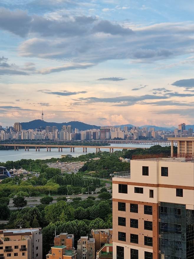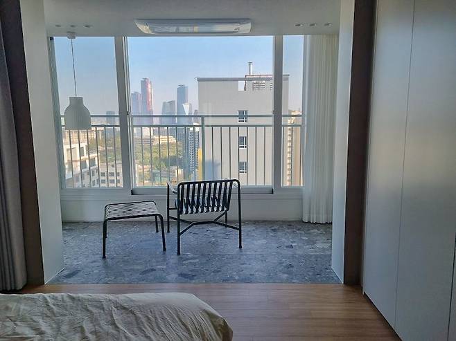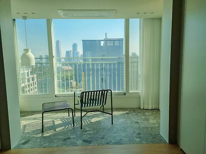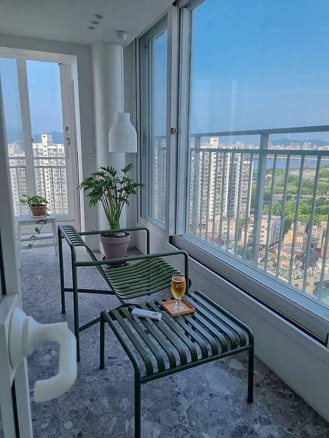 주말에는 화장실 청소, 냉장고 정리까지 싹 하고 음쓰 처리 후 집에 오자마자 샤워를 하죠. 그리고 나서 사진의 이 공간에서 한강을 보면서 칠링한 맥주 한 잔 마시면 그렇게 좋을 수 없어요. 제 힐링 포인트입니다.