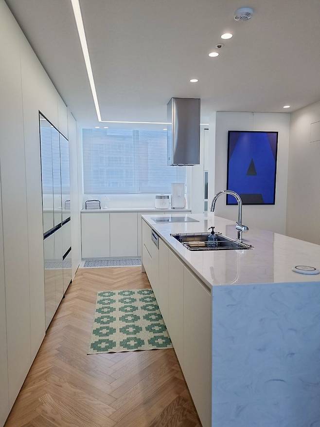 화이트와 블루를 좋아해서 포인트 소품들은 블루로 색을 맞췄어요. 라인조명은 디자인팀에서 추천해주신 아이템인데 비용 대비 꽤 효과가 좋아요. 주방이 아주 환해집니다.