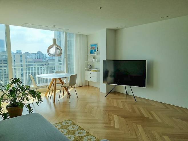 고층이라 낮 시간 동안 꽤 밝아요. TV가 붙어있는 날개벽이 내력벽이라 철거가 불가했고 그 뒤쪽 다이닝 테이블이 놓여있는 공간이 원래 거실 베란다에요. 단열에 신경 써서 확장하고 샷시는 전체 교체했어요. 확장하길 너무 잘했어요.