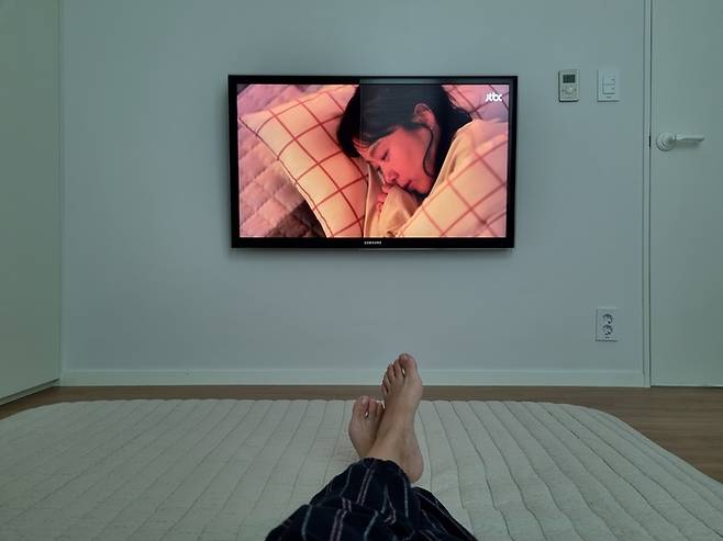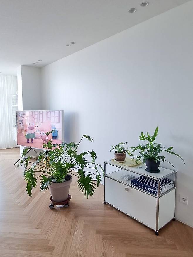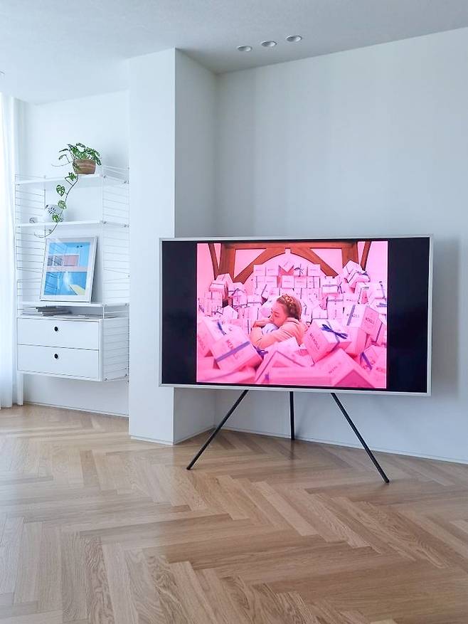 더프레임 TV 2020년 버전이라 아주 저렴하게 구입했어요. 남편이 거실 벽에다 TV 붙이는 것을 강력하게 반대해서 스튜디오 스탠드 옵션 추가해서 세워놨는데 꽤 튼튼하고 보기에도 예뻐요. 이렇게도 가능하다는 것 보여드려요.