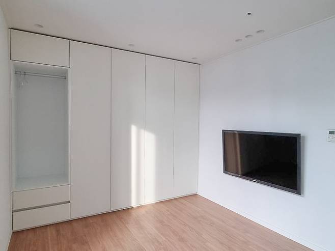 붙박이장 한 칸만 일부러 도어를 안 달았어요. 평소에는 입었던 옷을 보관하고 손님이 오시면 손님 옷 걸어둘 용도예요.