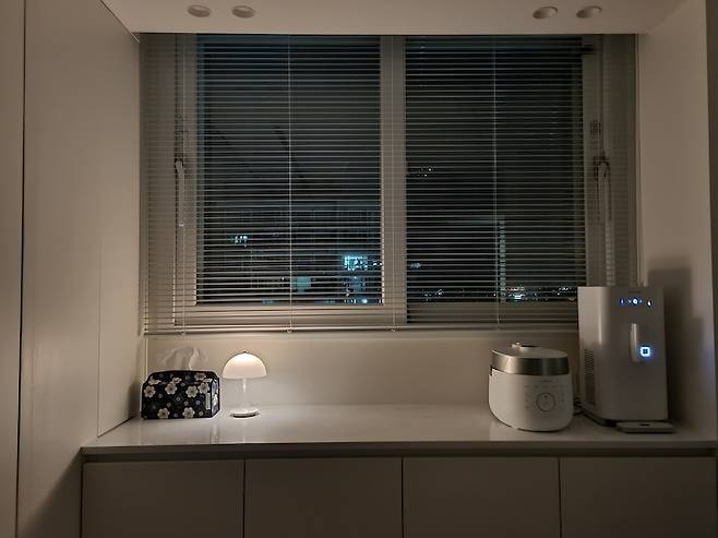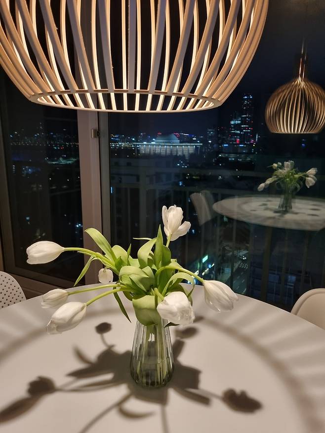 펜던트등만 켜면 바깥 야경을 잘 볼 수 있어요. 화려한 시티뷰가 펼쳐져요. 펜던트등과 튤립이 창에 비치는 모습이 예뻐서 찍어봤어요.