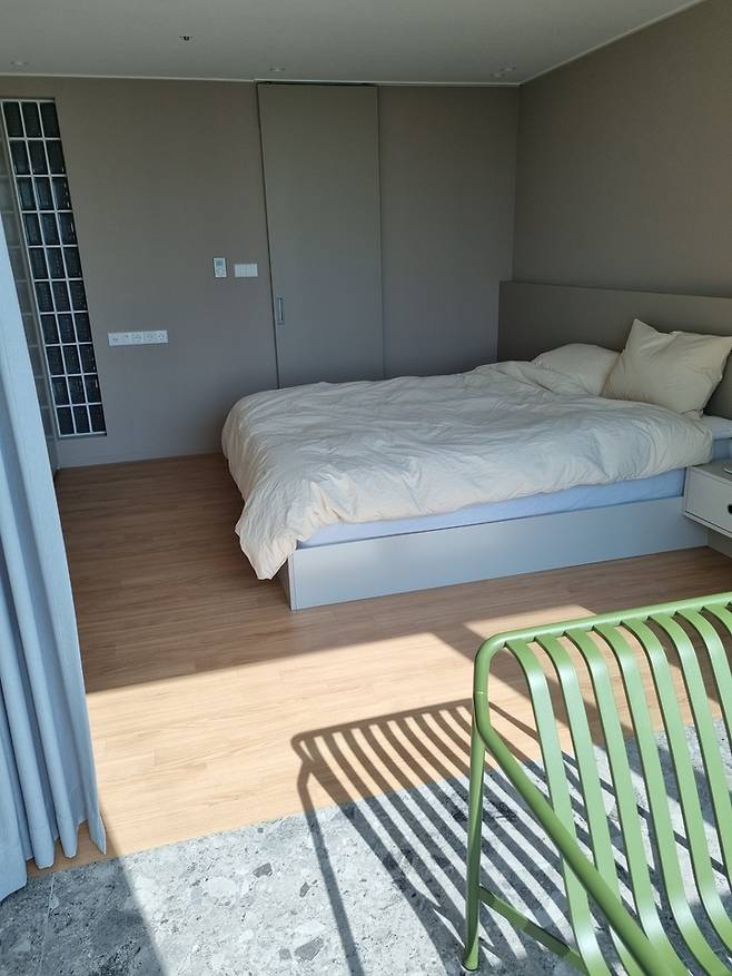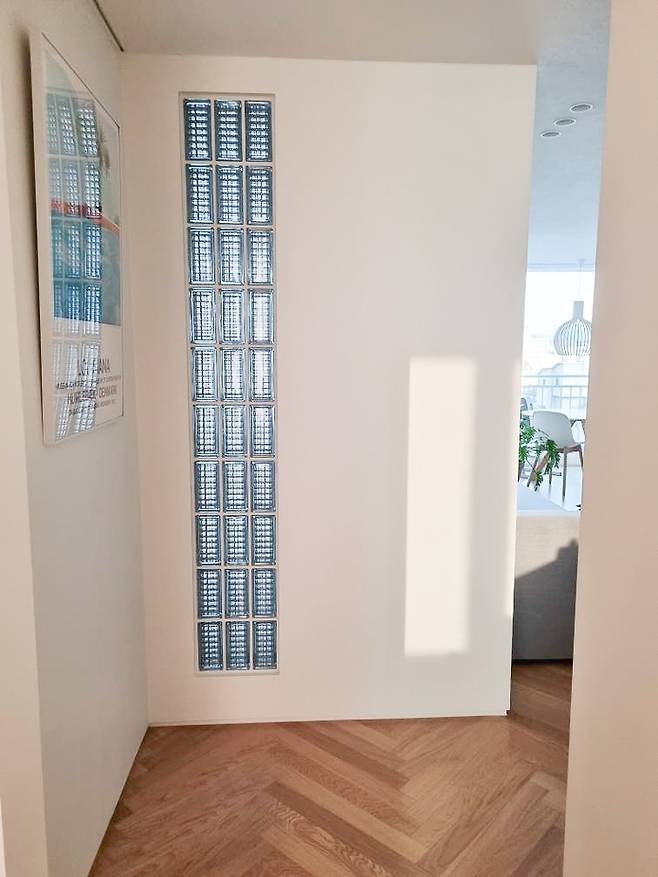 눈치채셨나요? 구조 변경을 했습니다. 안방과 마주 보는 방을 게스트룸으로 쓸 계획이라 공간 분리가 확실히 되도록 원래 있던 안방 문을 막고 그 자리에 유리블럭을 넣었어요. 독특하죠? 그 너머 안방 안쪽으로는 길게 붙박이장을 벽면 전체에 짰어요.