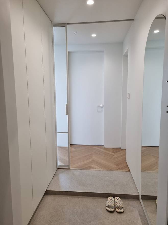 아주 심플하지만 환하고 깔끔한 우리 집 현관입니다. 좁은 현관과 아담한 붙박이장이지만 세 식구의 신발들, 골프백 2개와 골프용품들, 남편과 아들 자전거 용품들까지 알차게 수납되어 있어요. 리모델링할 때 제작가구를 넣는다면 그 안에 어떤 물건을 수납할지 미리 결정하는 게 너무 중요해요.