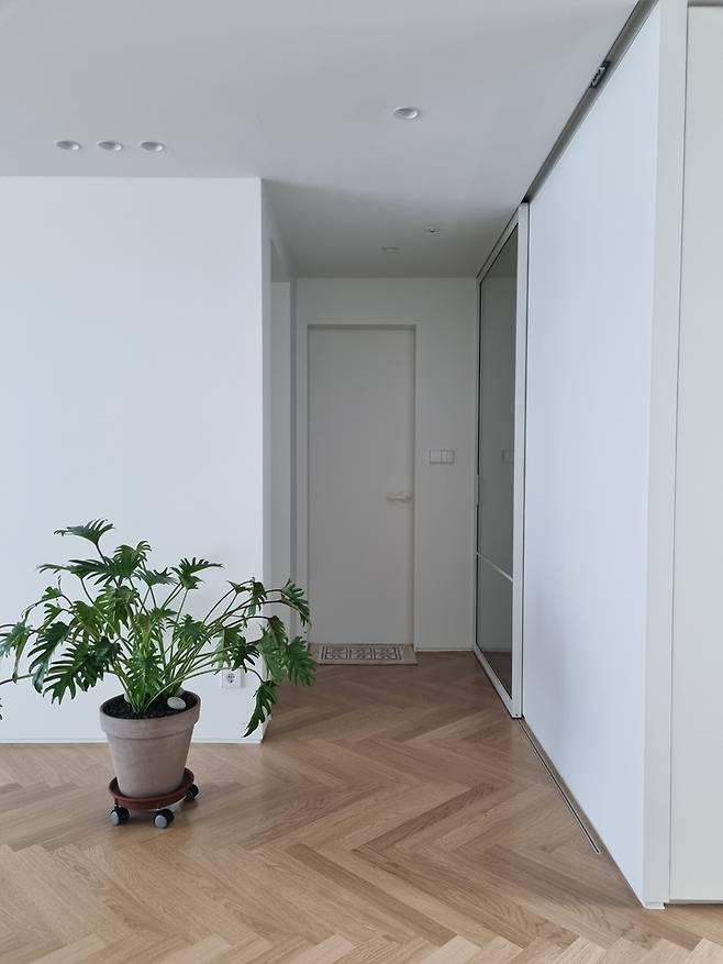 헤링본 패턴의 마루를 깔면 눈이 어지럽지 않을까, 공간이 복잡해보이지 않을까 염려하시는 분들을 봤는데 거슬리지 않아요. 한층 더 세련된 무드를 만들어 줍니다. 헤링본 패턴 마루에 관심 있으신 분들은 꼭 하셨으면 좋겠어요. 실제로 보면 더 예뻐요. 도장벽과 헤링본 패턴의 마루가 꽤 잘 어울리죠?