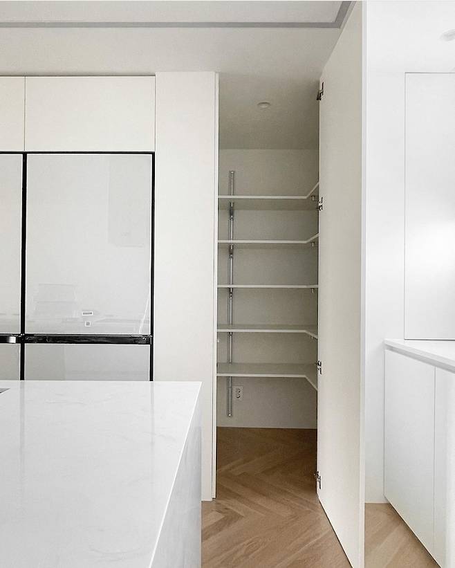 보조주방을 확장했는데 원래 보조주방 냉장고 자리에는 팬트리장을 짰어요. 팬트리장은 정말 신의 한 수 입니다. 최고!! 미니멀 라이프를 가능하게 해주거든요. 엄청난 양의 짐이 수납됩니다. 레이아웃 생각하는 단계라면, 팬트리장은 무조건 넣으세요. 적극 추천합니다.