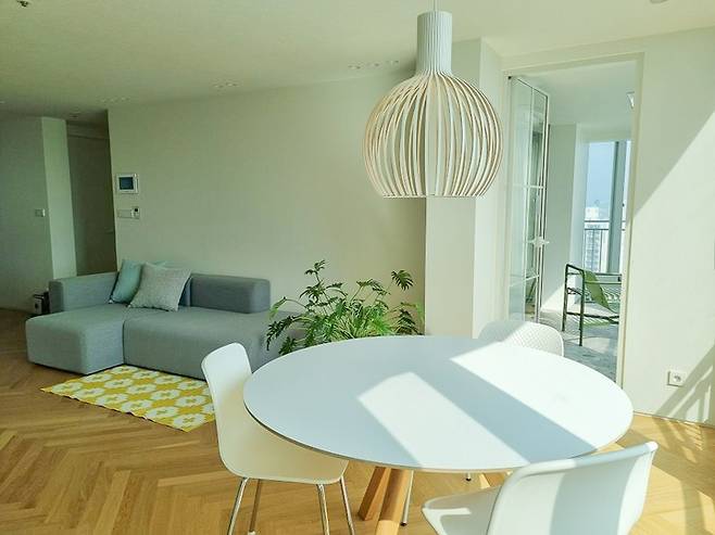 가장 좋아하는 구도의 우리 집 모습입니다. 원형의 다이닝 테이블에서부터 안방 확장면 베란다 도어와 라운지 체어까지 예쁜 것들이 한눈에 들어와서 좋아요.
