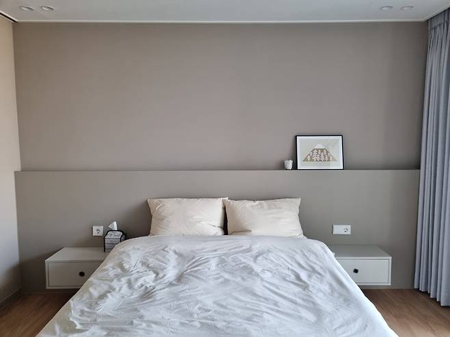 헤드 포함 침대 프레임, 협탁은 제작 가구입니다. 목수님이 현장에서 뚝딱뚝딱 만드셨는데 목수님들은 정말 금손이신 것 같아요. 제작 가구는 이사갈 때 가져갈 수 없는 단점도 있지만 그 공간에 알맞게 설계된 거라 항상 정돈된 느낌이 있어요. 무엇보다 청소하기 너무 너무 좋아요. 오래 살 계획이라면, 리모델링할 때 제작가구도 같이 고민해보세요.