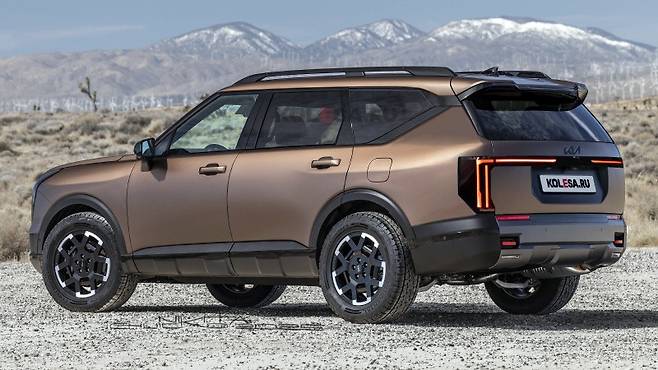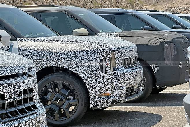 새로운 텔루라이드의 전면부는 더욱 대담하고 카리스마 넘치는 모습으로 변모했습니다. 특히 이중으로 쌓인 주간주행등(DRL)은 안쪽으로 꺾여 들어가며 기아의 시그니처인 ‘타이거 노즈’ 정체성을 한층 더 강렬하게 이어가고 있습니다. 이는 EV9에서 선보인 ‘스타맵 시그니처 라이팅’과 유사한 형태로, 차폭을 강조하고 시각적인 안정감을 더해줍니다. 라디에이터 그릴은 더욱 커지고 입체적인 패턴을 적용하여 웅장함을 극대화했으며, 범퍼 하단에는 견인 고리 포인트까지 갖춘 X-Pro 전용 오프로드 스타일링이 더해져 기능성과 함께 터프한 이미지를 완성합니다. 이는 단순한 도심형 SUV를 넘어 어떤 환경에서도 강력한 성능을 발휘할 수 있는 잠재력을 시각적으로 보여주는 요소입니다.