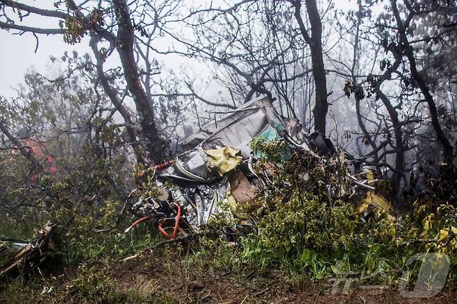 (바르자간 AFP=뉴스1) 우동명 기자 = 20일(현지시간) 에브라힘 라이시 이란 대통령을 태운 헬기가 추락한 바르자간 산악 지역에서 잔해가 보이고 있다. 2024.05.21