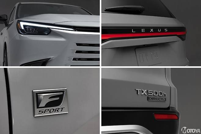 대형의 차체를 가진 렉서스 TX의 외관은 '실용적 우아함(Practical Elegance)'을 메인 컨셉트로 잡고 렉서스의 새로운 디자인 언어 중 하나인, '유니파이드 스핀들(Unified Spindle)'이 반영된 모습이다. 지난 6월 밀라노에서 공개한 LBX를 통해 드러난 이 독특한 스타일링은 지금까지의 렉서스 스핀들 그릴을 차체 전면까지 확장한 개념의 '스핀들 바디(Spindle Body)' 스타일을 넘어, 헤드램프, 범퍼 전체, 그리고 차체 형상에 걸쳐 더욱 크게 확장한 개념에 더 가깝다. 여기에 대형의 SUV임을 고려한, 정교한 공력 설계가 적용된다.