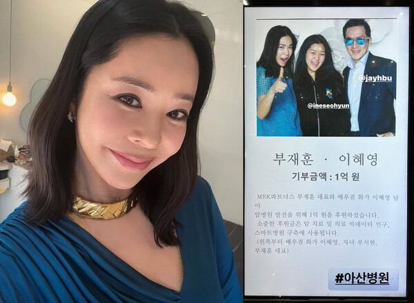 사업가 남편과 함께 서울아산병원에 1억원을 기부했다는 인증샷을 올린 이혜영.