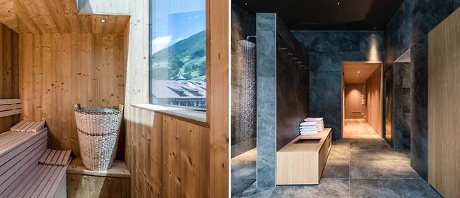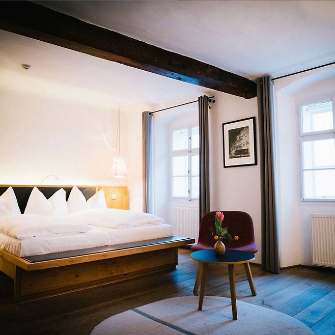 두 번째는 복층 구조의 스위트룸이다. 2층에는 침실이 있다.이곳에서 잠을 자면, 역사적인 목재 지붕 디자인을 볼 수 있다. 잘츠부르크 인테리어 디자인 숍 베아크샤우(Werkschau)는 디자인 요소가 스위트룸 전체적인 매력에 차원을 더하는 가구를 구성했다.
