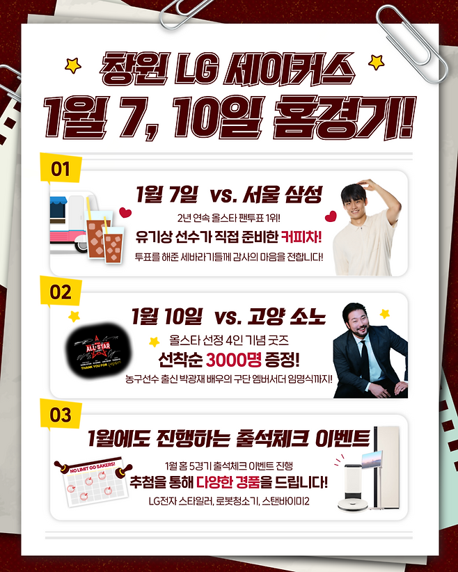 1월에도 홈 5경기 출석체크 이벤트도 진행되며, 추첨을 통해 LG전자 스타일러, 로봇청소기, 스탠바이미2 등을 지급할 예정이다.