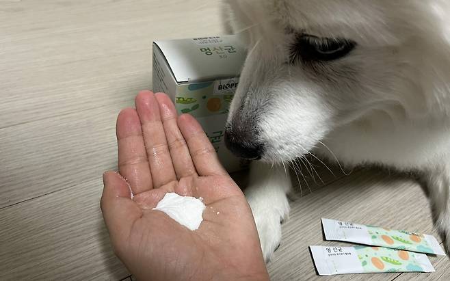 캡슐 형태인 유산균은 급여가 조금 어려울 수 있는데요. 멍산균은 가루 형태로 한 포씩 개별 포장 되어 있어 뜯어서 가루만 주거나 사료, 간식에 뿌려주면 되어서 먹이기 너무 편했어요. 기호성이 좋아 특별히 먹이기 위해 노력할 필요도 없었구요.