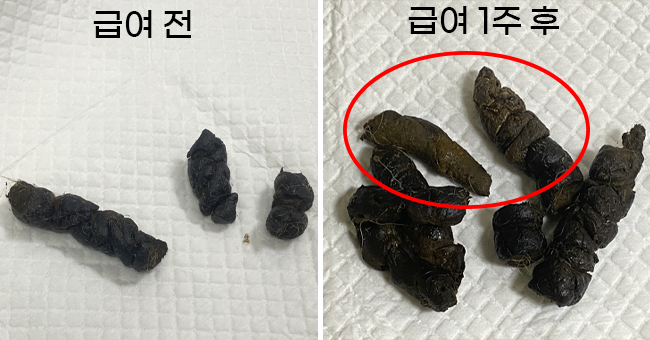 이번에 멍산균을 급여하니 점점 변 상태가 좋아지는 게 보였어요. 일주일 정도 급여하니, 더 부드럽고 밝은색의 변을 보기 시작했습니다. 체감 상 업그레이드되기 전 버전보다 빠르게 변 상태 개선이 되는 것 같았어요.