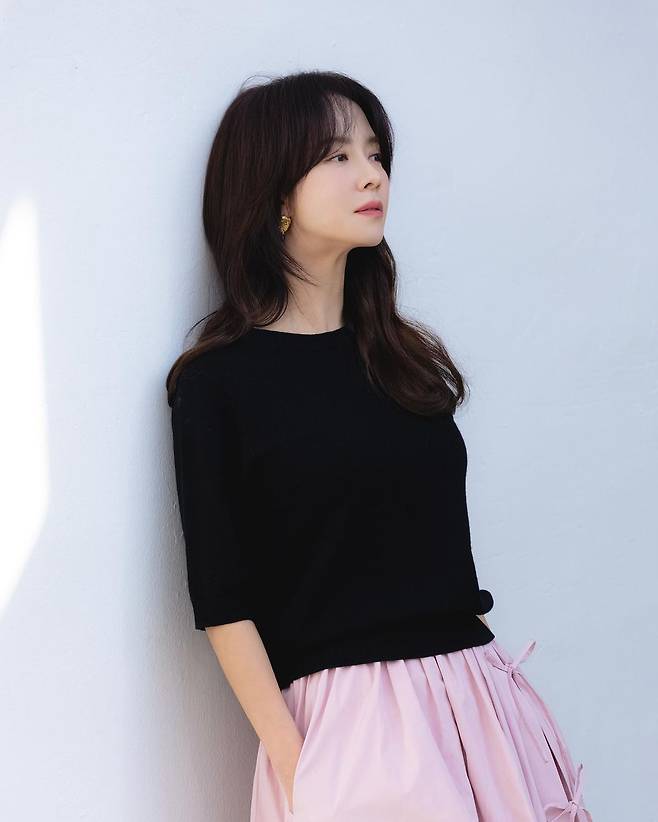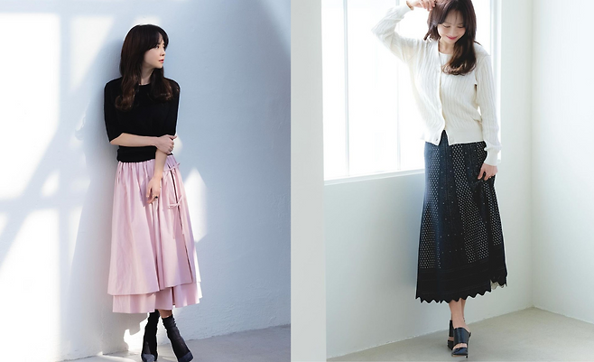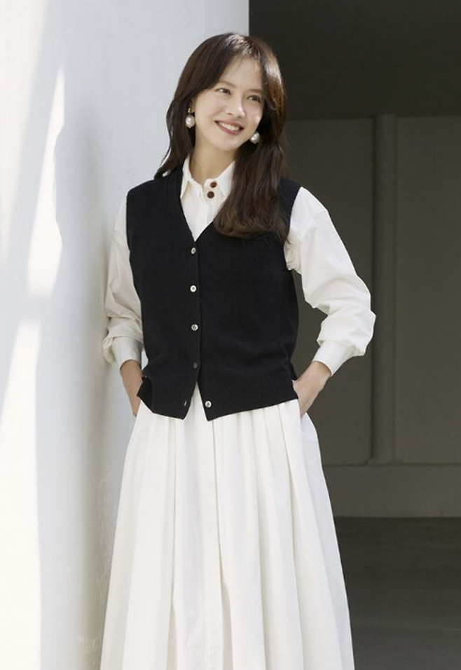 사진 속 송지효는 블랙 5부티를 입고 핑크 롱 스커트와 흰 골지 가디건과 도트 무늬가 있는 블랙 스커트를 입고 단아한 코디를 선보였다. 또 다른 사진에서는 흰 셔츠와 블랙 베스트로 코디하여 시크한 세미정장룩을 선보였다.