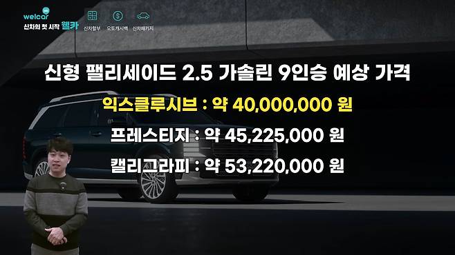 신형 팰리세이드 9인승 모델의 가격은 개별소비세를 제외하고 약 4,000만 원으로 예상된다. 하이브리드 모델은 이보다 400만 원에서 450만 원 더 비싼 것으로 보인다. 이는 기존 카니발 9인승 가격을 참고해 추정한 것이다.