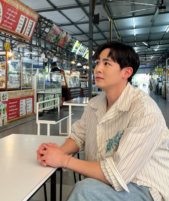 첫 번째 사진 속 닉쿤은 스트라이프 셔츠에 데님 팬츠를 매치해 편안하면서도 산뜻한 무드를 연출했다.