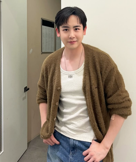 닉쿤은 크림색 슬리브리스 티셔츠 위에 루즈핏 브라운 니트 가디건을 걸쳐 부드러운 분위기를 자아냈다.