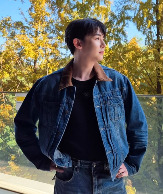 또 다른 사진에서는 가을 단풍을 배경으로 데님 재킷을 착용한 모습이 담겼다.