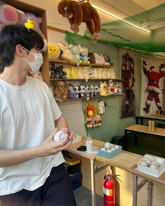 또 다른 사진에서는 야구공을 들고 실내 게임장 안에서 장난스러운 모습을 보여준다. 이때도 그는 같은 룩을 입고 있지만, 배경이 바뀌자 또 다른 무드가 연출된다. 선반에 가득한 인형들과 초록 그물망, 그리고 그의 해맑은 표정이 어우러지며 마치 어린 시절로 돌아간 듯한 동화 같은 장면이 완성된다.