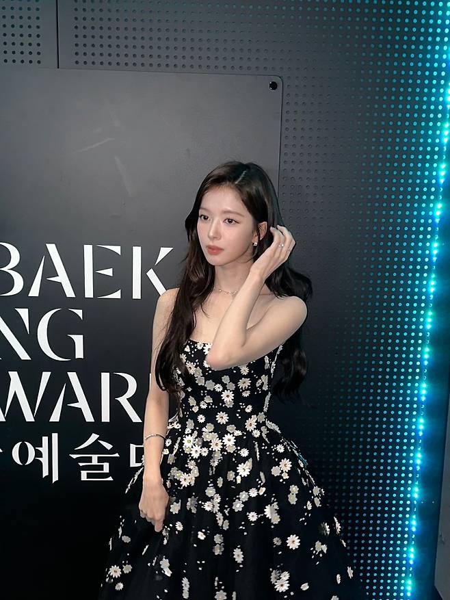블랙 바탕에 화이트 플로럴 패턴이 프린트된 미디 드레스를 선택한 노정의는 여성스러운 매력을 발산하고 있다. 스트랩리스 디자인의 드레스가 어깨 라인을 깔끔하게 드러내며, 플레어 실루엣이 우아한 분위기를 완성하고 있다.