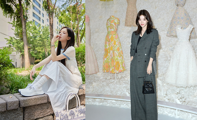 베이지와 화이트 톤의 레이어드 원피스를 착용한 노정의는 편안하면서도 세련된 일상 패션을 선보이고 있다. 디올 토트백과 화이트 스니커즈의 매치가 럭셔리 캐주얼 스타일을 완벽하게 구현하며, 자연스러운 포즈가 편안한 매력을 더하고 있다.