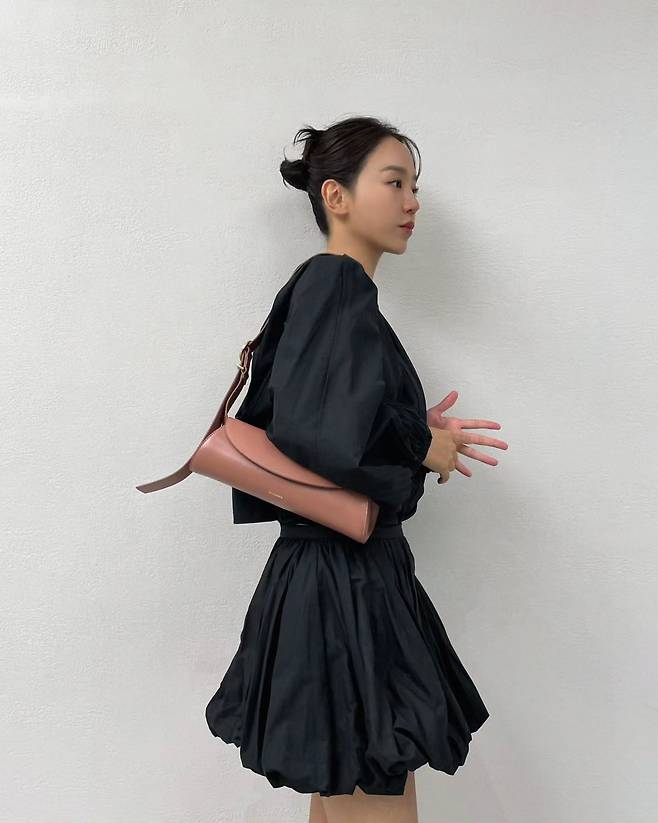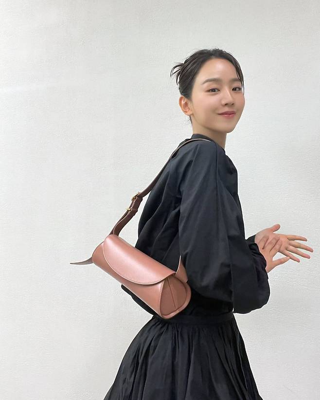 길게 늘어지는 가방의 스트랩과 독특한 가로형 디자인이 신혜선의 세련된 무드와 어우러져 전체적인 룩에 현대적인 감각을 더해주고 있습니다.