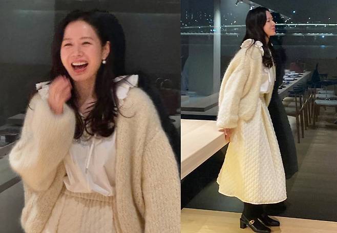 손예진은 크림색 니트 카디건과 퀼팅 디테일이 돋보이는 플레어 롱스커트를 매치해 포근하면서도 세련된 분위기를 연출했습니다.