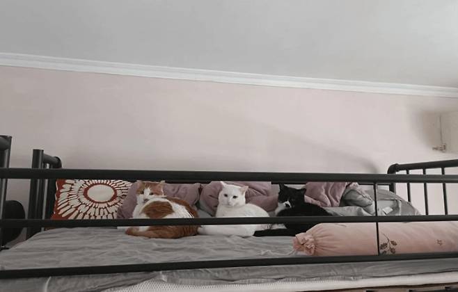 특히 평소엔 침대에 못 올라가게 했던 집사가 잠시 자리를 비운 사이, 세 마리 고양이가 나란히 침대 위에 누워 있는 모습을 발견한 적도 있는데요, 이런 순간들은 오랫동안 재미있는 추억으로 남게 됩니다.