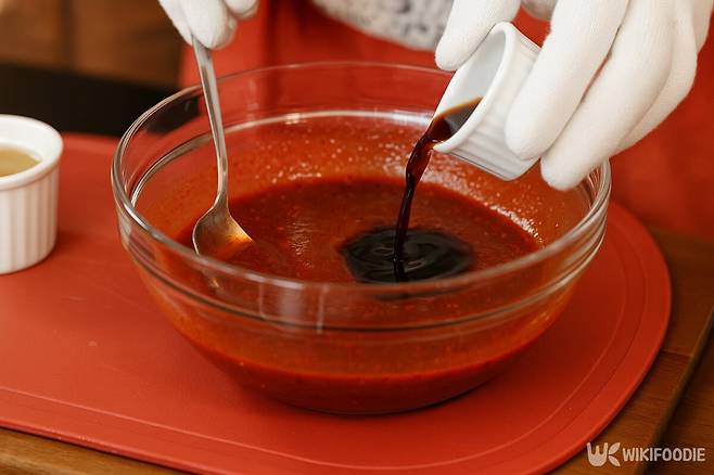 5. 고추장 8큰술, 고춧가루 3큰술, 맛술 3큰술, 진간장 1큰술, 물엿 2큰술, 다진 마늘 1큰술, 참기름 1큰술 섞어 양념장을 만든다.