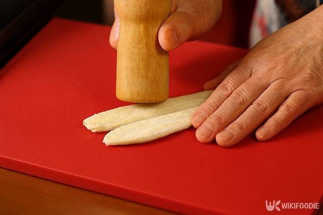 2. 더덕을 반으로 가른 뒤, 머리 쪽부터 자근자근 두드려 납작하게 편다.