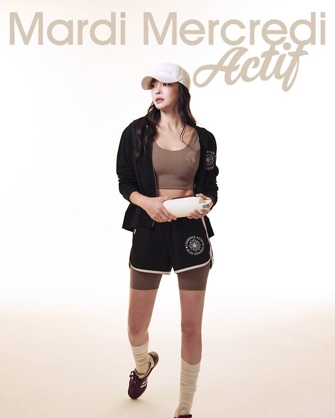 'Mardi Mercredi Actif' 로고가 돋보이는 스포츠웨어 세트로 활동적인 매력을 과시하고 있다. 브라운 컬러의 크롭 탑과 블랙 쇼츠, 그리고 니하이삭스를 매치한 스타일링은 스포티하면서도 트렌디한 감각을 보여준다. 화이트 캡과 블랙 집업 재킷을 레이어드하여 완성도 높은 애슬레저 룩을 연출하고 있다.