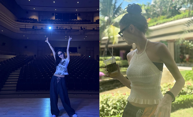 'NEW YORK CITY' 프린트가 들어간 화이트 티셔츠와 네이비 와이드 팬츠를 조합한 편안한 데일리 룩을 선보이고 있다. 안경을 착용하고 양팔을 들어 올린 자유로운 포즈로 편안하고 자연스러운 매력을 드러내고 있다.