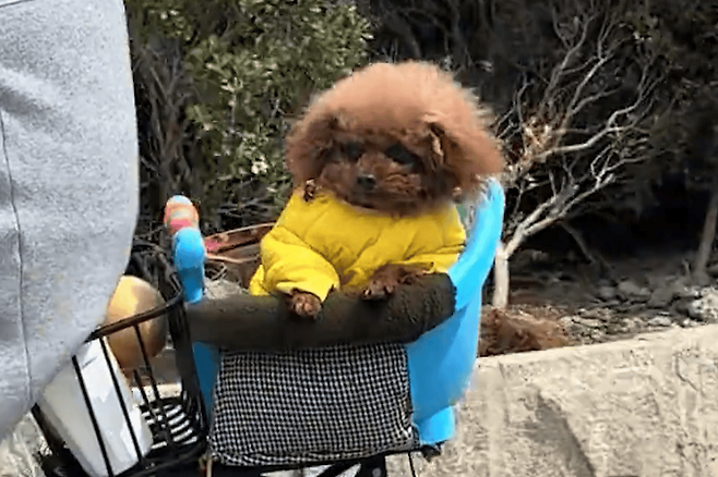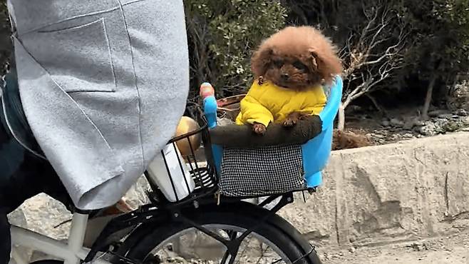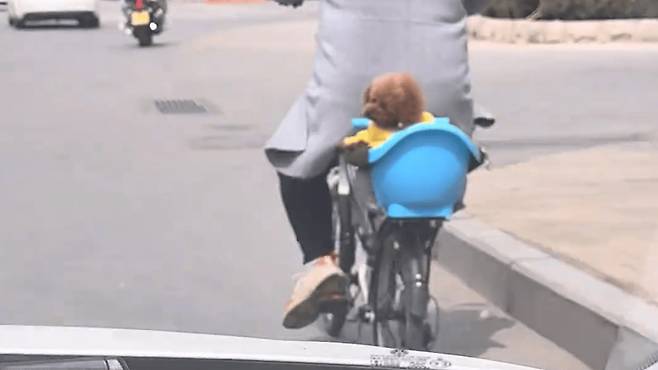 자전거 뒷좌석에 설치된 어린이용 의자에 강아지가 의젓한 모습으로 앉아 있다니 믿기 힘들었습니다!