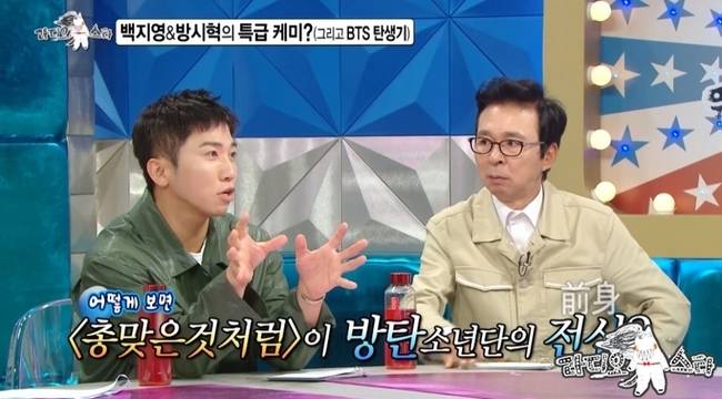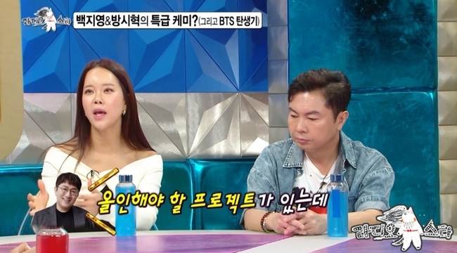 백지영은 방시혁이 자신의 앨범 작업을 거절하면서‘어떤 프로젝트에 올인하고 있다’고 밝혀 멋지게 서로 이별을 할 수 있었다고 밝혔다. 이어 “얼마 뒤 방탄소년단이 나왔다”라는 백지영의 말에MC 유세윤은 “'총 맞은 것처럼'이 방탄의 전신 같은 느낌”이라고 말을 꺼냈다. 이에 백지영은 “왜 방탄일까 그 생각을 하긴 했거든요”라고 웃었다.