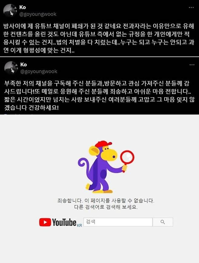 유튜브 채널이 삭제된 후 고영욱은 8월 23일 X(구 트위터)를 통해 억울함을 토로했습니다.