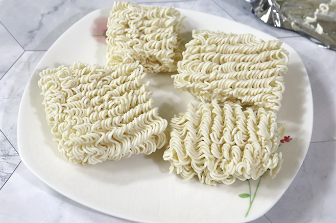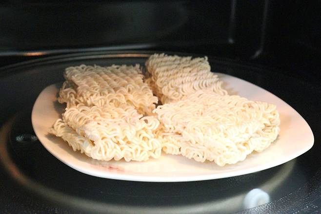 전자레인지용 접시에 조각낸 라면을 올려서 1분 30초 먼저 돌리고, 뒤집어서 1분만 더 돌려주세요