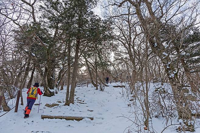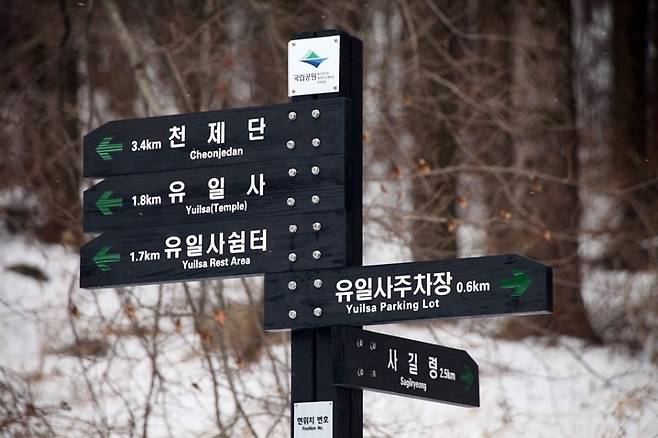 유일사 안내소는 해발 약 800~900m에 위치한 고원 지대입니다. 이미 이 지점부터 공기는 차갑고, 발아래로는 눈이 단단히 다져져 있습니다. 탐방을 시작하자마자 들려오는 ‘뽀드득’ 눈 밟는 소리가 겨울 산행의 분위기를 단번에 끌어올립니다. 유일사 쉼터까지는 비교적 완만한 경사로 이어져 몸을 풀며 걷기에 좋습니다.