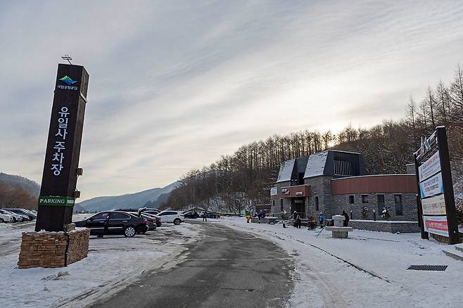 유일사 안내소는 해발 약 800~900m에 위치한 고원 지대입니다. 이미 이 지점부터 공기는 차갑고, 발아래로는 눈이 단단히 다져져 있습니다. 탐방을 시작하자마자 들려오는 ‘뽀드득’ 눈 밟는 소리가 겨울 산행의 분위기를 단번에 끌어올립니다. 유일사 쉼터까지는 비교적 완만한 경사로 이어져 몸을 풀며 걷기에 좋습니다.