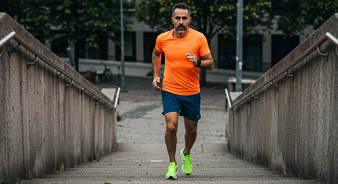 계단을 빠르게 오르고, 내려올 때는 천천히 걸어 내려갑니다. 10~15분만 반복해도 걷기 1시간 이상의 효과를 냅니다.