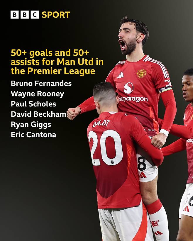 영국 매체 'BBC'는 17일 사회괸계망서비스(SNS)를 통해 "페르난데스는 맨유에서 50골 50도움을 달성한 여섯 번째 선수"라고 알렸다.